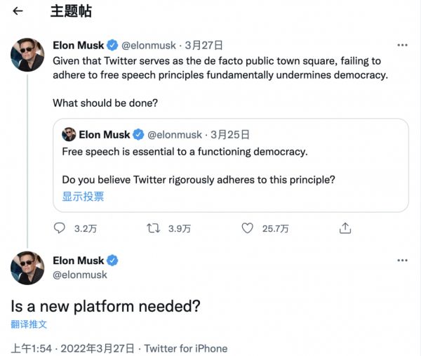 马斯克转发投票结果后,再次补充说,“是否需要一个新的平台?”直到4月4日,马斯克摇身一变,成为推特最大的外部股东后,大家才意识到,世界首富真的在考虑建立一个新的社交媒体平台。