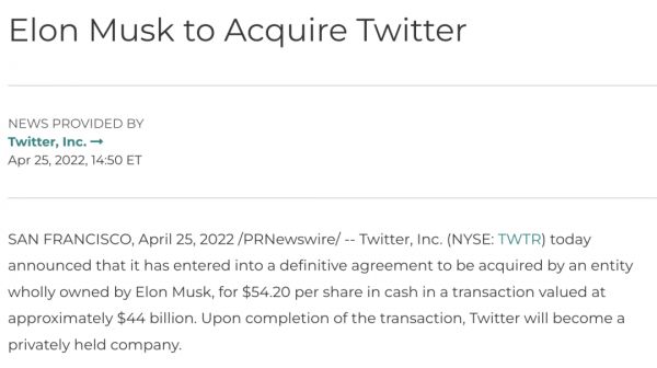 Twitter于4月25日宣布,董事会已经全票通过了马斯克的收购要约,公司将以每股54.2美元的价格(约合440亿美元,2880亿元人民币),全资出售给马斯克。