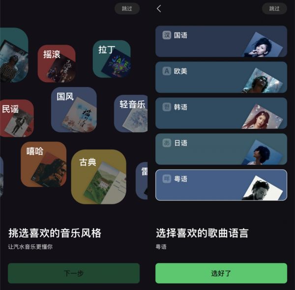 果酱妹输入邀请码之后,就进入了大部分音乐App首次使用时会出现的界面——挑选喜欢的音乐风格和歌曲语言,为其之后推荐歌曲做铺垫。