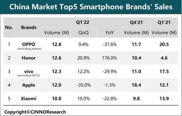 第三方市场机构CINNO Research最新数据显示,2022年第一季度,中国大陆智能手机市场的销量为7439万部,较去年同期大幅度下滑14.4%。而荣耀逆势增长,较去年同期增长176%,环比涨幅达20.9%,在所有品牌中,销量排名第二,卖出了1260万台手机,与排名第一的OPPO相差无几。