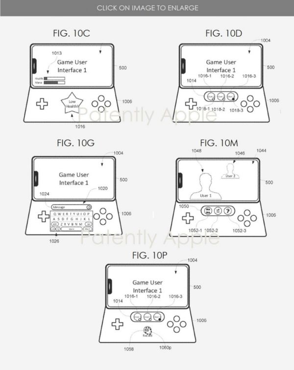 第一种,是专利图中的 6A、6B、6F、6J,类似于 Switch 的 JoyCon 手柄,能将 iPhone 和 iPad 变成一个便携式游戏设备。其中的一半手柄看似可以连接到 Lightning 接口,但不清楚另一半手柄如何配对。