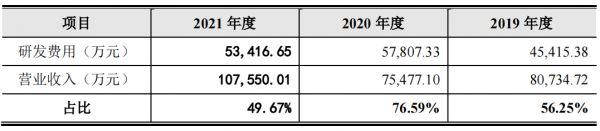 研发投入比高出了科技类公司的正常水平。2019年、2020年和2021年,公司研发费用分别为 4.54亿元、5.78亿元和 5.34亿元,最近三年累计研发投入合计超过15.66亿元;公司最近三年累计研发投入占近三年累计营业收入比例高达59.39%。