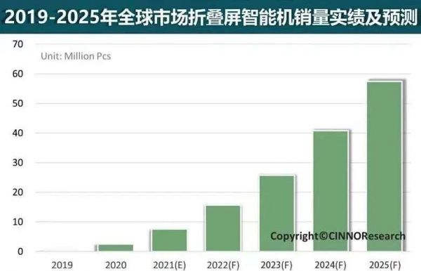 根据CINNO Research预测,2022年全球市场折叠屏智能手机销量有望达1,569万部,同比增长107%。未来随着折叠机成本的持续下降、技术的革新、产品的逐渐丰富以及软件不断升级,市场规模将持续扩大,CINNO Research认为,2025年全球折叠屏智能手机销量有望达5,740万部,年均复合增长率CAGR达66%。