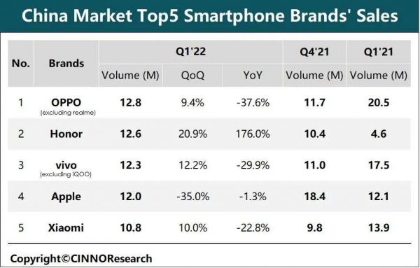 分品牌来看,2022年一季度中国大陆手机销量前五名中,登顶的是OPPO,销量为1280万辆,环比增长9.4%,但环比仍下降37.6%。第二名是荣耀,销量1260万辆与OPPO相当,环比增长20.9%,同比大增176.0%,实现逆势增长。第三名为vivo,销量为1230万,环比增长12.2%,同比下降29.9%。第四名是苹果,销量1200万,环比下降35.0%,同比下降1.3%。最后是小米,以1080万的销量排在第五,环比增长10%,同比下降22.8%。
