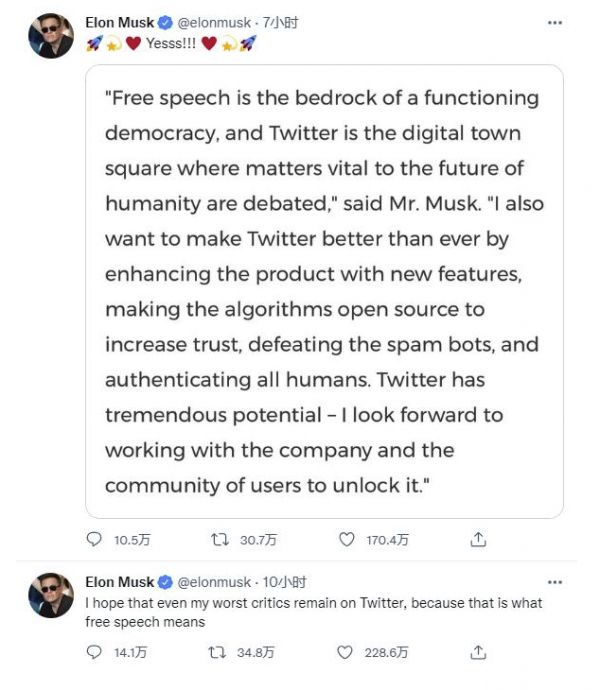 在收购成功后,马斯克也宣布将把算法进行开源,用户可以知道自己怎么查看这条信息流的,同时自己的评论为什么会在这儿,解决用户对平台不信任的问题,同时提到会消除假粉丝,并进行真人真人认证。