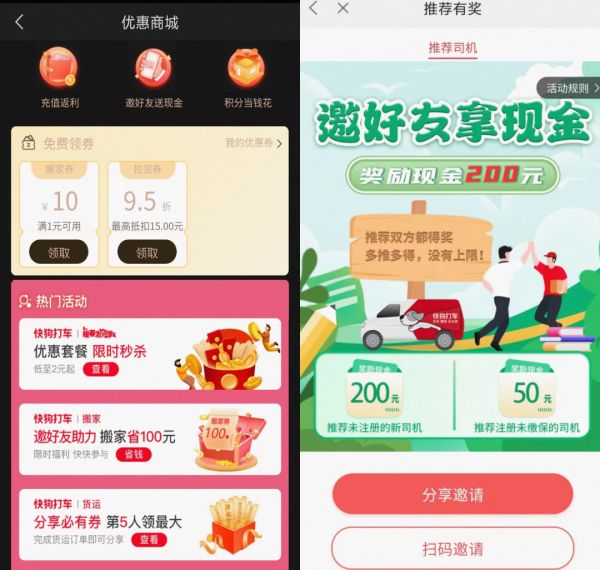 而在司机版中,快狗打车也在杭州范围内推出了“邀好友拿现金”的拉新奖励,即邀请一位未注册的新司机奖励200元,邀请一位已注册未缴保的司机奖励50元。