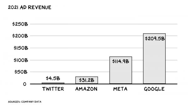 该公司在靠广告支持的媒体泥潭中举步维艰,为了追求永远无法实现的利润而牺牲平台质量来换取注意力。从 Twitter 身上,我们能直观地了解数字领域的“次规模”一词。在这一领域,谷歌、Meta 和亚马逊等三大巨头占据了绝大部分市场。
