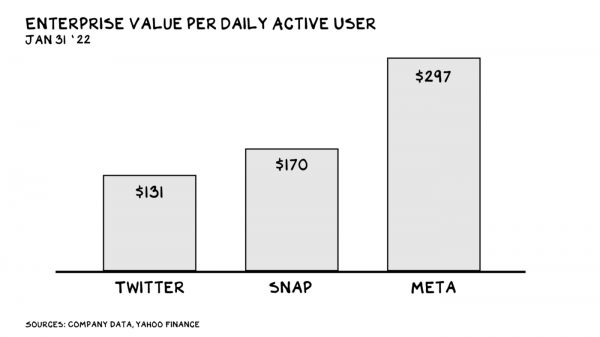 基于日活用户数量而估算的企业价值(数据截止至2022年1月31日)。图片来源:Scott Galloway