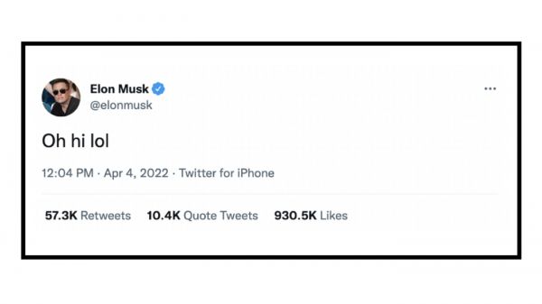 4月4日,马斯克发表了自收购Twitter股票后的第一条推文:“Oh hi lol”(哦,嗨,哈哈哈),表达了自己愉悦的心情。