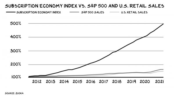 2012年至2021年订阅经济指数(图中黑色线条)、标普500指数(图中深灰色线条)与美国零售业(图中浅灰色线条)发展趋势。图片来源:Scott Galloway