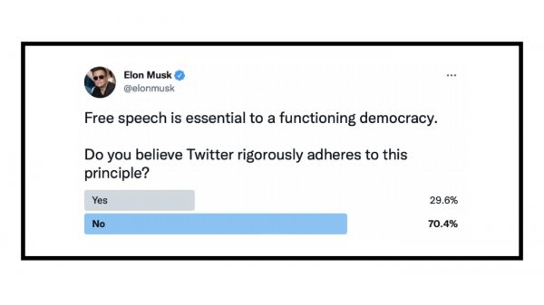 3月25日,马斯克在 Twitter 上发起了一则投票,就该平台是否遵守了言论自由原则展开了民意调查。投票结果显示,在 200 多万名参与者中约有 70% 认为“Twitter 没有遵守言论自由原则”。
