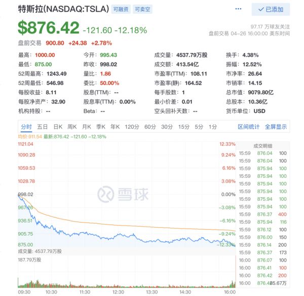 4 月 26 日,特斯拉股价大幅下跌 12% 到 876.42 美元/股,最新总市值为 9080 亿美元,一夜之间「蒸发」1260 亿美元(约合 8260 亿元)。这是特斯拉自 2020 年 9 月以来单日最差表现,在纳斯达克 100 指数中表现垫底。