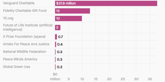 截至2017年,在马斯克基金会所捐赠的相关利益主体中,捐赠金额最大的三个为:YC.org 1000万美元、先锋和富达旗下两个顾问基金共5000万美元,而2018年,富达投资曾领投向SpaceX注资5亿美元。这三起捐赠金额一共占到了其捐赠额的86%。