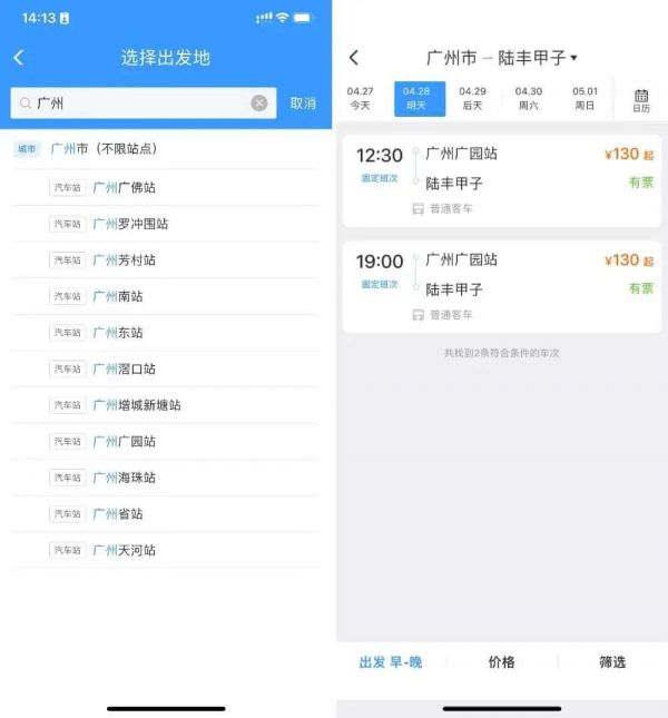 选好地点后点击「查询汽车票」会出现两趟汽车固定班次信息。