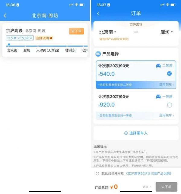 如查询北京南站到廊坊的随心乘,就能查到京沪高铁的计次产品,二等座往返 20 次售价 540,换算成单次为 27 元(这趟耗时仅 21 分钟的列车单程票价为 28 元)。