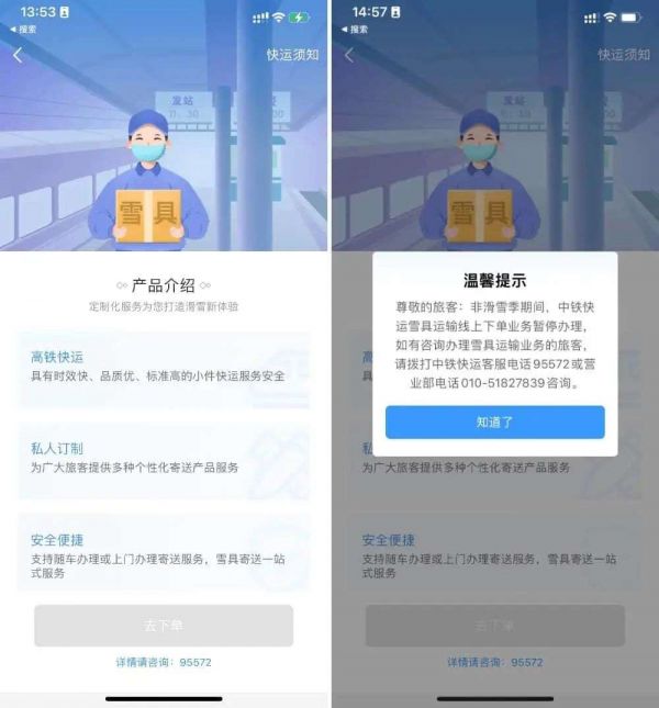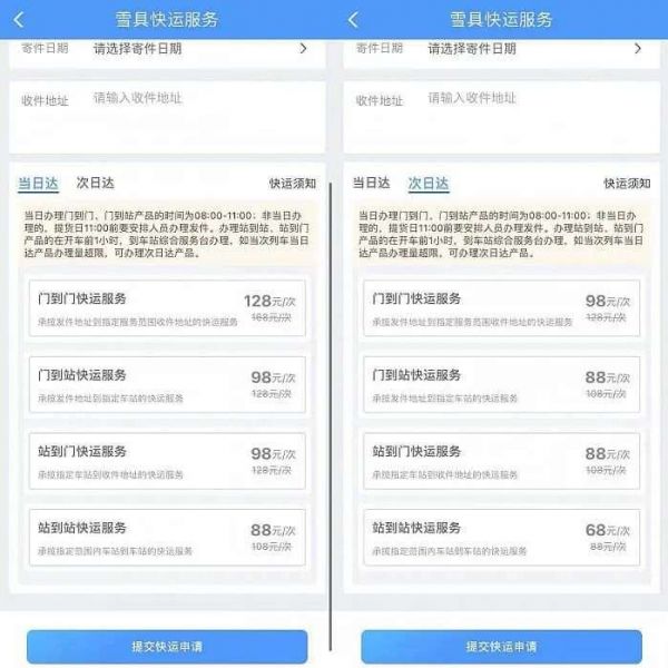 雪具快运可选择门到门、门到站、站到门、站到站四种方式。当日达到价格为 88 到 128 元,次日达价格为 68 到 98元。当日达服务需当日 11 点前办理,次日达需在前一日 18 点前办理。只是目前非滑雪季(一般北方滑雪场开放时间在 11 月底至来年 3 月初),12306 提示暂停办理该业务。等到滑雪季来临,雪友们就可以尝试用高铁寄雪具了。