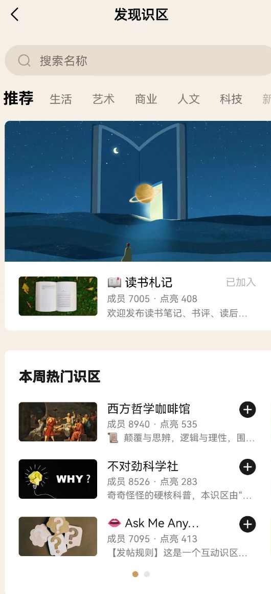 此外,该序列还会展示已加入的识区,一键直达。“西方哲学咖啡馆”“人工智能研究院”“不对劲科学社”“猫奴补习班”……识区设置了各类兴趣小组,用户可自行选择加入。