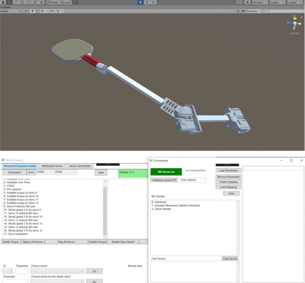 VR乒乓球软件主要使用的是Unity3D游戏引擎创建,包括一个VR乒乓球、记分牌和一个指导视频,以及在游戏中激励用户的拉拉队。VR环境与逆向运动学系统相连,使用WebSockets3控制和同步球拍的运动与机器人的运动。