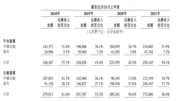 同城货运的商业模式并不复杂。招股书显示,快狗打车的三个业务板块分别为平台服务、企业服务、增值服务,分别在中国内地和海外两个市场活动。其中平台服务、企业服务占据了 95% 以上的收入。