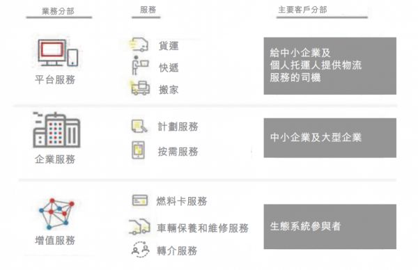 平台服务和企业服务可以简单理解为 toC 和 toB 业务。平台服务是在平台上匹配司机及托运人,从司机处收取佣金。企业服务是指给有托运需求的企业提供服务,和企业签订订单协商向企业收取服务费。