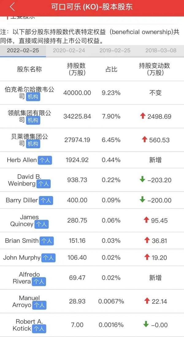 并且,“股神”沃伦·巴菲特对可口可乐公司相当“长情”,自巴菲特从1988年买入之后,一直坚定持有。截至去年底,沃伦·巴菲特旗下公司伯克希尔·哈撒韦持有可口可乐公司9.23%的股份。