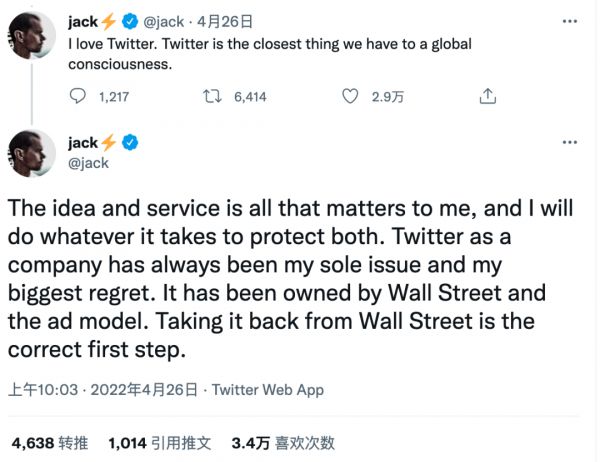 多西发推:将 Twitter 从华尔街手里夺回是正确的第一步。(来源:Twitter)