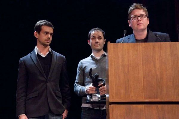 2009 年初 Twitter 三位创始人在一场颁奖礼上,从左至右分别是多西、埃文和比兹,此时多西已失去 CEO 职位。(来源:flickr)