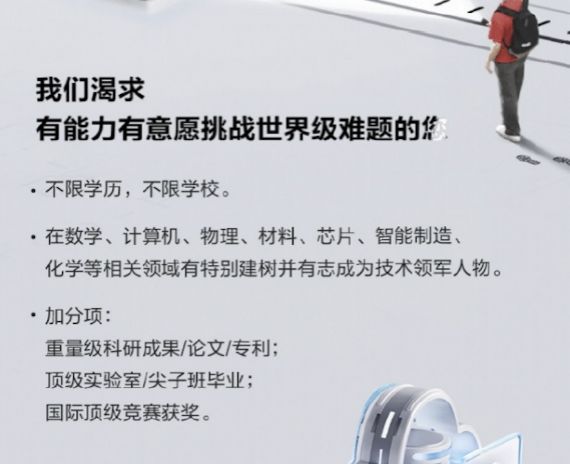 华为对应聘者不限学历和学校,但是要求在数学、计算机、物理、材料、芯片等相关领域有特别建树并有志成为技术领军人物。