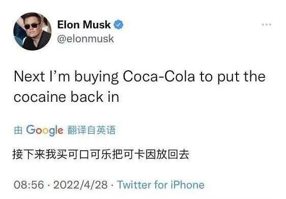 4月28日凌晨,马斯克在推特发文称,接下来可能考虑收购可口可乐,不过一个小时后,马斯克就发文表示“让我们来开一个推特最大的玩笑!”并在随后回复网友收购麦当劳的提议中,写到“听着,我不会创造奇迹好吗?”
