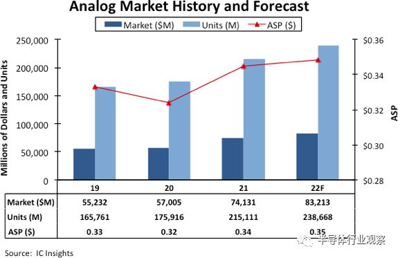 2021年模拟IC市场达到了741亿美元的历史新高,强劲的需求和供应链中断导致去年模拟IC的平均销售价格上涨了6%。IC insights预计,2022年模拟IC总销售额将增长12%至832亿美元,单位出货量将增长11%至2387亿。在模拟IC蓬勃发展的同时,模拟芯片厂商大刀阔斧的进行扩产投资,纷纷迈向了12英寸晶圆产线。模拟芯片的12英寸时代来临。