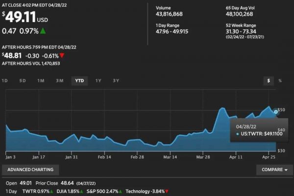 财报公布后,Twitter股价在交易日小幅上涨1%,停留在49.1美元。