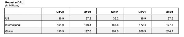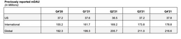 从2018年Q4开始,Twitter对于用户规模的披露就采用了mDAU这一指标,希望更精准的数据去反应用户价值,但本季度对该指标再次做出调整,修正了前5个季度的数据。