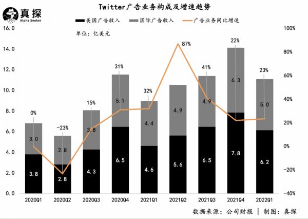 2022Q1,Twitter广告业务收入为11.1亿美元,同比增长23%,环比下降21%(Q1通常是广告支出淡季)。其中美国市场广告收入为6.2亿美元,国际广告收入为5.0亿美元。