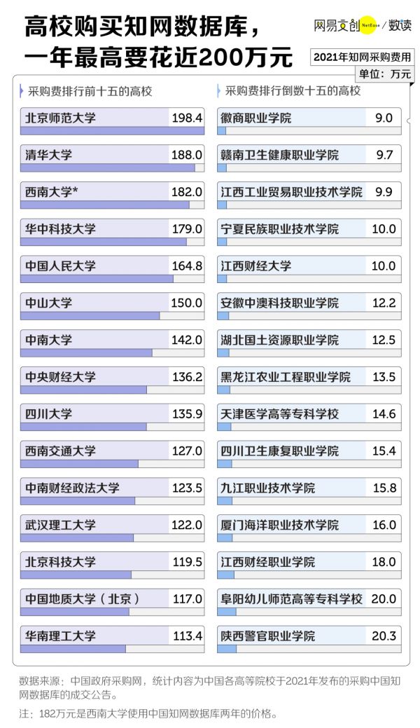 2021 年采购知网数据库花费排名前列的高校,多为 985、211 院校。花上百万购买知网数据库一年使用权,是稀松平常的事。