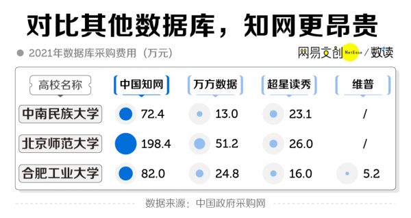 2021 年,合肥工业大学一口气购买了中国知网、万方数据、超星读秀、维普四个数据库,其中知网的费用达到 82 万元,而万方数据不过才 24.8 万,不到前者的三分之一。