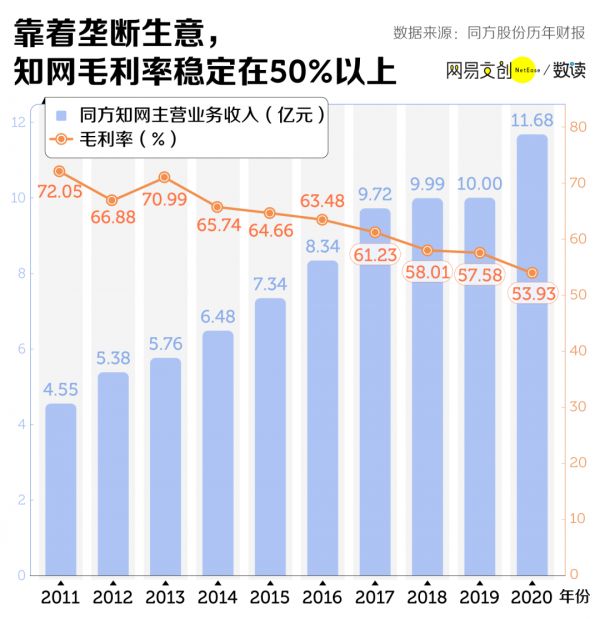 2011 年,提供中国知网服务的同方知网(北京)技术有限公司(以下简称同方知网)毛利率甚至高达 72% [7]。近年来,同方知网的毛利率虽然已有所下降,但净利润依旧可观。