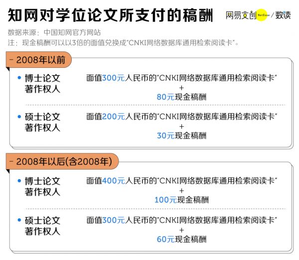 对于 2008 年及以后发表的学位论文,硕士生可领取现金稿酬 60 元加面值 300 元的知网检索卡,博士生则可领取 100 元和面值 400 元的知网检索卡。