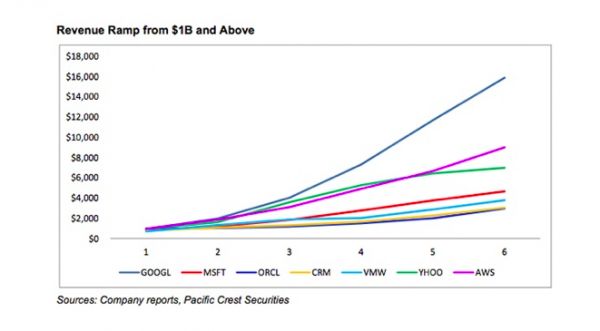 市场分析公司Pacific Crest Securities曾在2014年统计过,如果把亚马逊云服务(AWS)当做是一家独立的科技公司,那么它会是在收入达到10亿美元后增速历史第二快的企业级IT公司,仅次于Google。