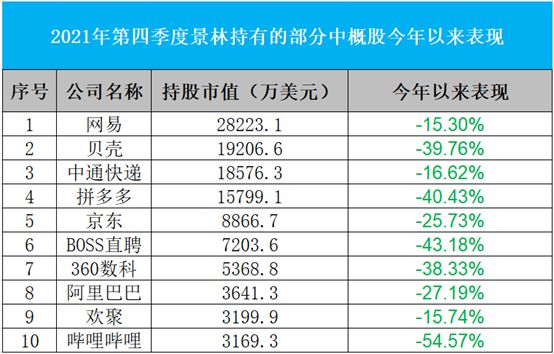 今年以来,景林重仓持有的部分中概股的平均跌幅已经超过了30%,哔哩哔哩股价惨遭腰斩,贝壳、拼多多、BOSS直聘、360数科等公司的股价跌幅也都在40%左右。