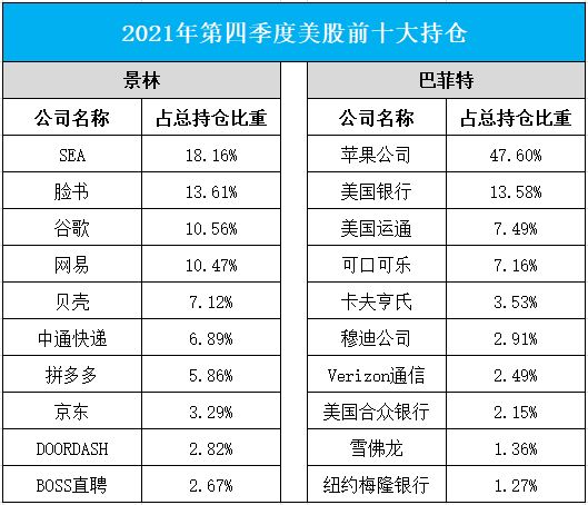 以2021年第四季度美股持仓为例,在景林的前十大持仓中,有四只是非中概股,并且前三大重仓股均不是中概股,其中头号重仓股SEA是一家号称“东南亚小腾讯”的互联网公司。