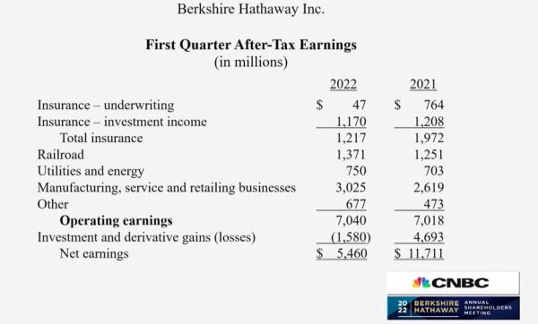 股东大会之前,伯克希尔公布了不如市场预期的今年一季报: