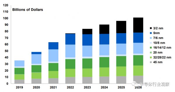 然而从工艺节点划分的代工收入来看,相较于先进工艺,成熟节点增幅缓慢,20nm及以上制程收入占比将逐年下降。当前,5G智能手机、WiFi、企业PC和数据中心的芯片仍是需求驱动因素,5nm需求将在2022、2023年持续增加,代工厂3nm工艺的爬坡速率低于预期,明年后将会迎来爆发式需求。