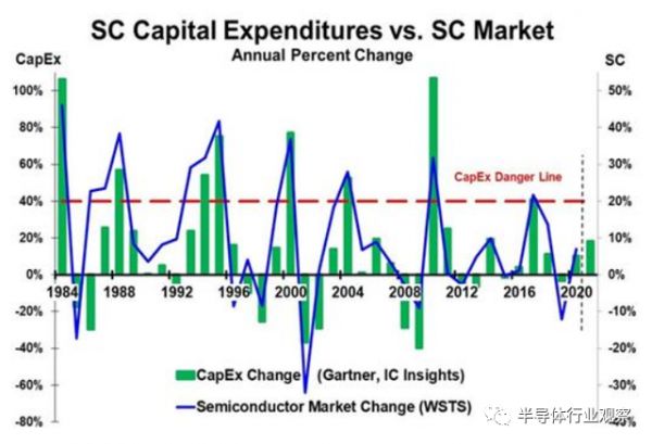 通过复盘历史周期得到非常重要的指标,那就是资本危险临界线。当资本开支增长超过40%的时候,通常预测未来会出现产能过剩和半导体增速下跌的情况。