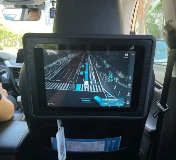 车内的很多设计都科技感十足,我能够通过小程序实时看到行程进度。一块车载屏幕被安置在前排座椅后面,专供乘客查看。这个屏幕上显示着实时路况,我可以直接了解到目前无人出租车的行驶路径、速度、周边的车辆和行人等等。
