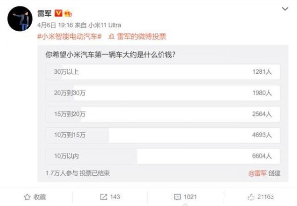 2021年4月,雷军曾在微博向粉丝发起一轮车辆定价投票。