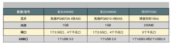 这次我们拿来测试的路由器有三款,分别是某米的AX9000、某云的AX6600和网件R7000。这三款路由器均提供了USB口,需要说明的是,前两款路由器算是近年推出的新品;网件R7000则是很多年前的路由器了,甚至不支持WiFi 6,让它加入测试,更多是作为对比参考。