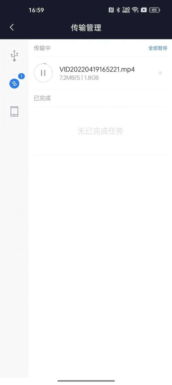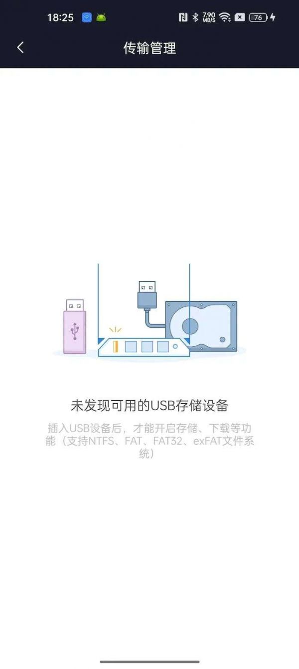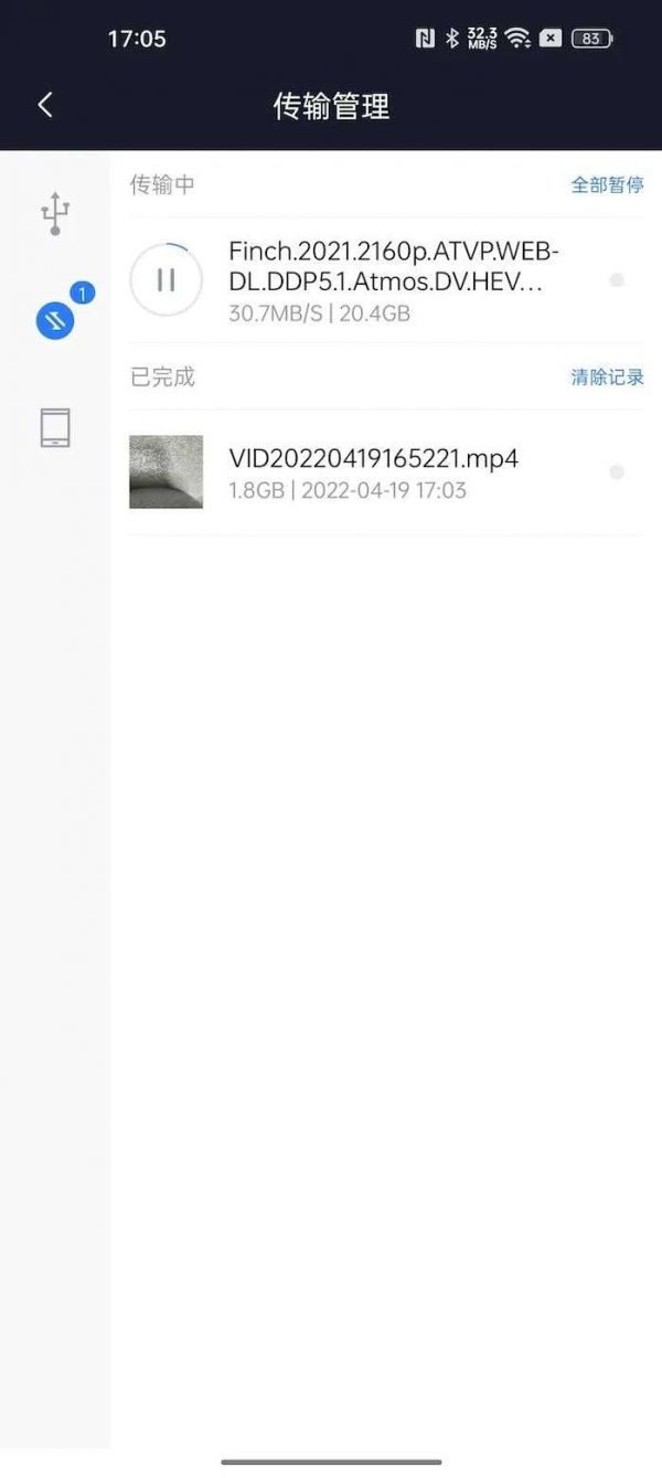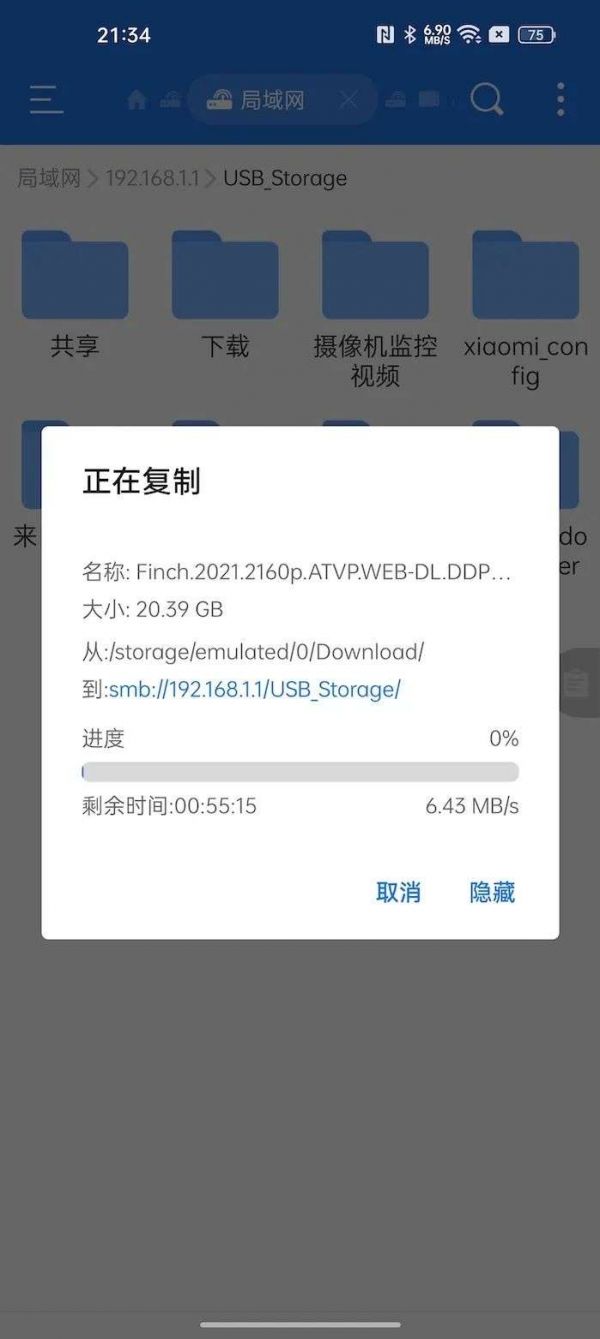 这款路由器设置NAS功能需要通过官方手机管理App,PC网页端虽然能看到接入硬盘的信息,但不能进一步操作。在手机App中,我们首先将手机中一个1.8GB体积的视频文件拷入到路由器硬盘中,实测速率为7MB/s左右,最终花了4分半时间。
