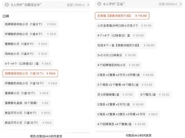 但到了代购手里,这些产品的价格分别上涨了不少。代购的出售方式论份不论斤,每份通常是8个装。海苔风味酥松小贝、蟹黄风味酥松口味每盒售价59.8元,柠檬酸奶酥松小贝和可可风味酥松小贝的分量多了两枚,售价也涨至69.8元/盒。