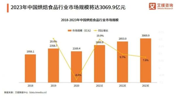 据艾媒体咨询数据统计显示,2013年之后,中国烘焙市场规模常年维持在2200亿元之上。到了2021年,中国烘焙食品市场规模预估达2600.8亿元,同比增长19.9%,按照这一增速,2023年,烘焙行业将正式迈出3000亿元大关。