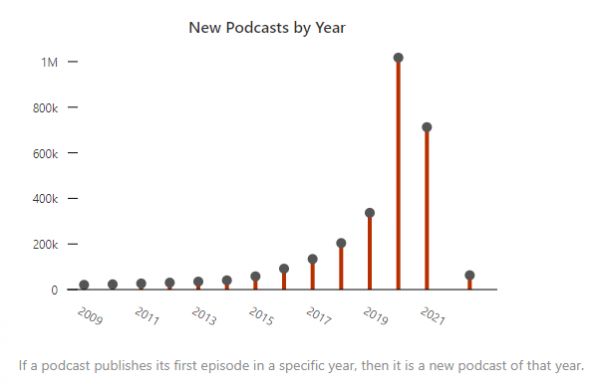 播客搜索引擎Listen Notes数据显示,截至2022年5月2日,全球有超过283万个播客。其中,仅2020年一年,就新增了超过95万个播客,而2021年新增播客数也有约90万。Omdia估计,到2025年,全球播客听众将从2019年的8亿增长到20亿。
